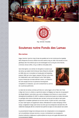 Le statut de nos lamas a évolué au fil du temps. Lama Ogyen a fui le Tibet vers l’Inde à l’âge de 20 ans et a obtenu un permis de séjour en Belgique sur base de son passeport de réfugié tibétain. Lama Karta a pu venir en Belgique via la France et a reçu le statut d’enseignant bouddhiste. En 1997, il a obtenu un permis de travail et un statut rémunéré. Il a partagé ce salaire minimum avec les deux Lamas qui l’aidaient en tant qu’enseignants et conseillers spirituels de nos trois centres. À partir de 2013, Lama Zeupa et Lama Tashi Nyima ont également obtenu officiellement le statut d’ employés. Entretemps, la législation belge avait évolué de sorte que nos enseignants devaient être officiellement employés afin de conserver leur permis de séjour et ainsi assurer leur avenir.